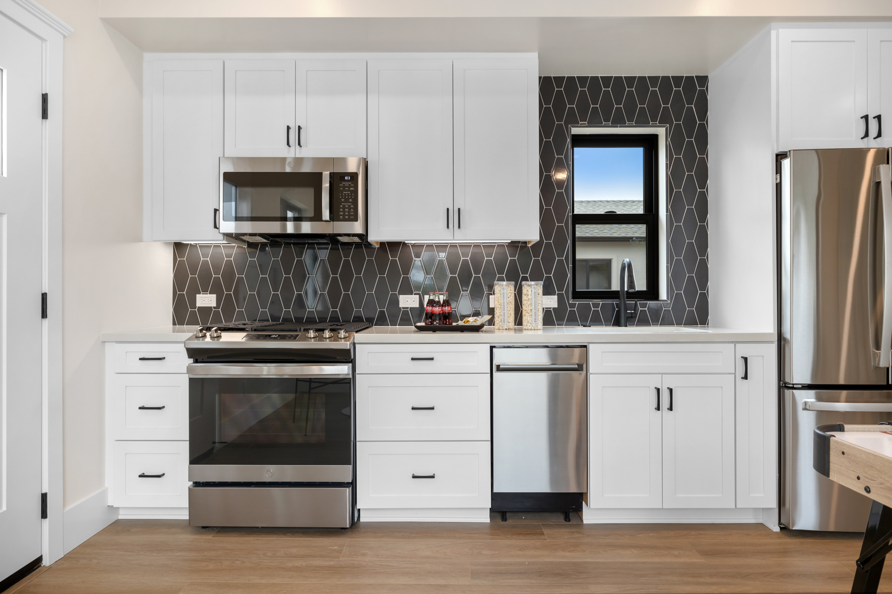 Adams Street Homes I is a newly constructed (2024), turnkey residential offering in Olde Carlsbad featuring a total of 6 bedrooms, 5 bathrooms, and approximately 3,811 square feet of living area across a main home, attached junior ADU, and detached ADU. The two-story main residence provides a generous 4-bedroom, 3-bath floorplan of roughly 2,800 square feet, designed around an open-concept great room and chef’s kitchen with quartz counters, large island, GE Café appliance package, and premium European oak flooring.